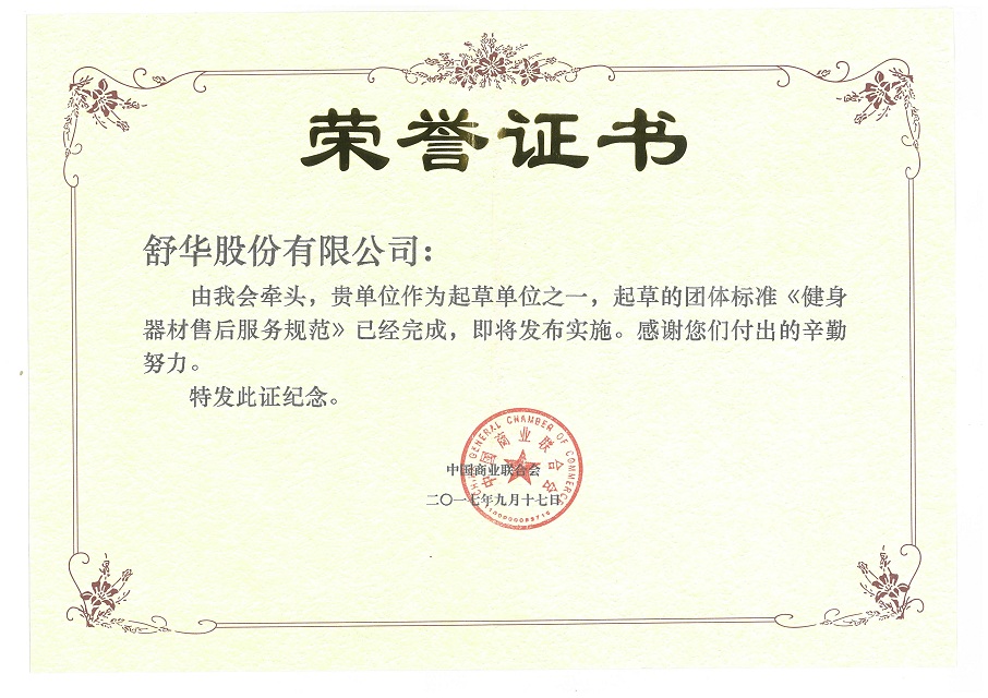 2017 健身器材售后服务规范团体标准起草 中国商业联合会 荣誉证书 查看